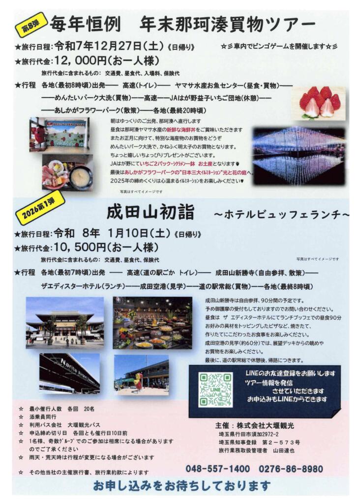 いつも大堰観光をご利用いただき、誠にありがとうございます。この度、年末のお買物と年始の初詣にぴったりの、豪華日帰りバスツアー2企画の募集を開始いたしました。